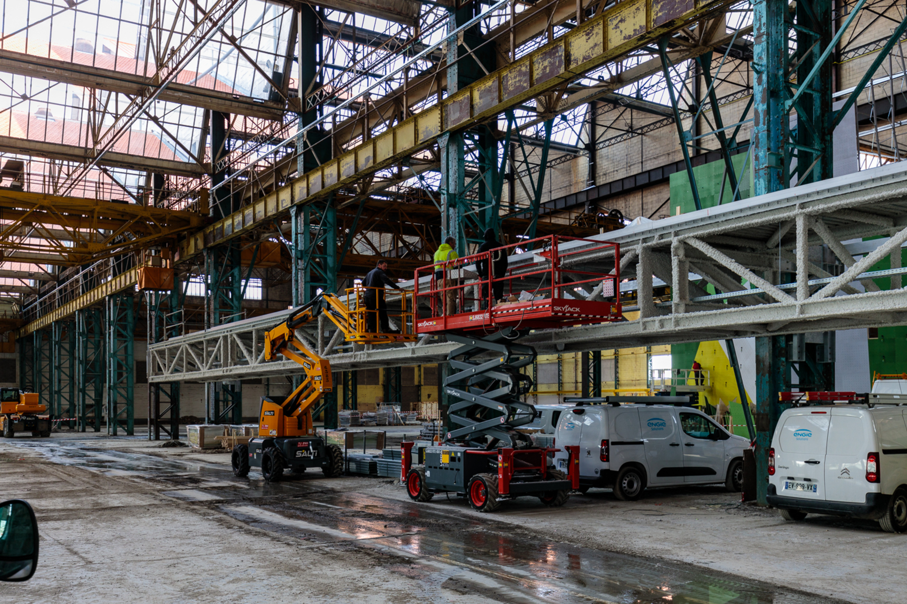 Aujourd’hui à mi-chantier, l’ancien bâtiment industriel prend forme. Notamment avec la pose du mur d’escalade qui sera parmi les plus grands d’Europe permettant la pratique de trois disciplines (vitesse, difficulté, bloc) en simultanées. L’escalade n’est pas le seul sport à être mis en valeur par cette structure titanesque.